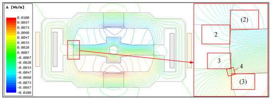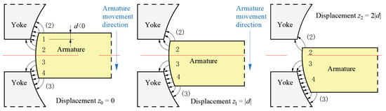 TMAAG with overlapping parts between the yoke and the armature (the opening is negative) was selected as the analysis object, and its air gaps were divided into four parts, where the thin lines with arrows represent the magnetic flux lines, as shown in Figure 5. In the initial position, part 1 and 2 are symmetrical to part 3 and 4. When electrified, owing to the negative feedback mechanism, the armature realizes the conversion of torque to displacement, which is uniformly shown as the center section after movement. At this time, because of displacement , part 1 disappeared, part 2 and 3 did not change significantly, and part 4 increased. From displacement to , part 1 and 4 changed, and the magnetic force on part 1 and 4 is in the radial direction. Therefore, changes in part 1 and 4 do not affect the variation of torque. From displacement to , part 4 continues to increase but basically does not affect the torque, part 3 remains the same, while part 2 changes significantly; the air path passing by is increased, which greatly reduces the permeance. The changes in part 2 and 3 are the main factors for the variation of torque. If the feedback torque needs to be changed rapidly with the armature displacement, the opening should not be designed to be negative.