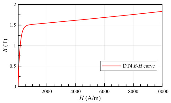 The magnetization curve of DT4 is shown in Figure 6. Using Maxwell 2D, the magnetic flux lines of TMAAG are simulated in Figure 7. The working principle is in line with expectations. When electrified, the magnetic flux on one side is strengthened, and the other side is weakened. After the armature is rotated or displaced, the change in the magnetic flux lines is also consistent with Figure 5, which verifies the above-mentioned discussion.