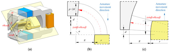 Here, is 0, is the parameter related to the width of the magnetic equipotential plane, is the opening between the yoke and the armature, is the length of armature wing, represents the permeability of the air, represents the linear displacement of armature, represents the pitch angle, represents the radius of armature, represents the rotation angle of armature. The value of is equal to in Figure 8b; it is related to the ellipse cut by the cylinder along the pitch angle. Since changes little, the given value is 1.52 rad.