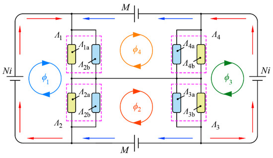 The permeance model of the magnetic-flux-strengthened side is shown in Figure 8b. According to (1), we can obtain: