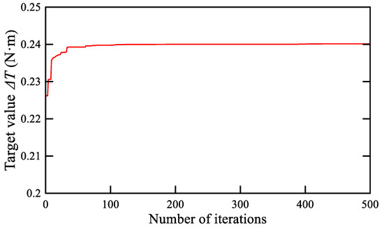 The target represents the torque value that changes every 0.1 mm. The test results show that the optimal levels of pitch angle, air gap, opening, length, and radius are 45°, 0.4 mm, 0.1 mm, 20 mm, and 28 mm, respectively. Among these factors, the air gap has the greatest influence, followed by the pitch angle. From the orthogonal test, the same trend as the analytical model can be drawn.