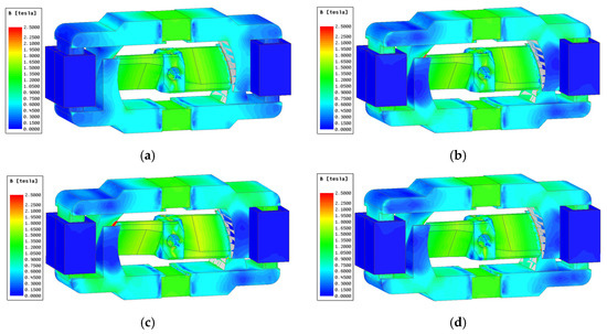 Before the experiment, a 3D model was established to perform FEM simulation in Maxwell 3D. The simulation cloud diagrams are shown in Figure 13. When TMAAG is not electrified, the magnetic flux is symmetrical. From Figure 13a,b after electrification, the magnetic flux in one side is strengthened and the other side is weakened. Figure 13c,d show magnetic flux variation after rotation and axial movement, respectively. The axial movement obviously plays a role of negative feedback and make two sides of the magnetic flux gradually closer.