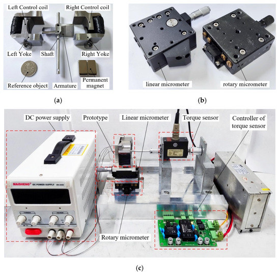 In order to further verify the analytical and simulation results, a prototype of TMAAG was machined, and an experiment platform was built, as shown in Figure 14a,c. The experiment platform includes the prototype, direct current (DC) power supply, torque sensor, controller, and linear and rotary micrometers. As shown in Figure 14b, the angular and linear displacement of the yoke relative to the armature can be changed by using the linear and rotary micrometer, respectively. The armature is fixedly connected to the torque sensor through the shaft, and thereby the torque of TMAAG at any position can be measured. Finally, the torque-angle and the torque-displacement characteristic curves can be obtained, which reflect driving torque and feedback torque, respectively.