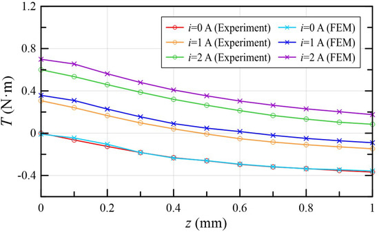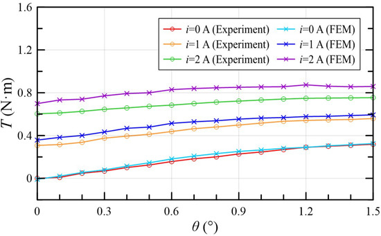 Torque-angle characteristics were measured when the current was 0, 1, and 2 A. The results were then compared with the corresponding FEM simulation, as shown in Figure 15. Table 4 summarizes the comparison data. With the increase in current and rotation angle, the torque presented an increasing trend, which is consistent with the analysis of and in Equation (17). When = 2 A and = 1.5°, the FEM and experiment results were 0.859, and 0.754 N·m, respectively. As the current gradually increased, the experimental result was smaller than the simulation value. The reason for such deviation might be that compared with the BH curve in the finite element model, the real soft magnetic material tends to be saturated more easily under high current excitation.