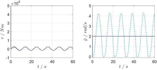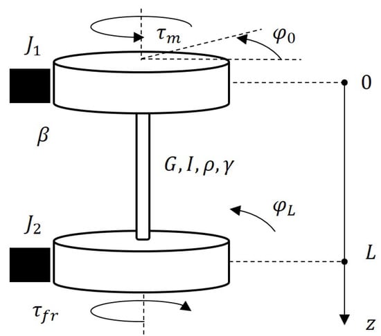 Here, is the rotational angle of the shaft, which depends on the spatial coordinate and time t, is the rotational angle of the first mass, i.e., the motor, is the rotational angle of the second mass, and are the first and second masses’ moments of inertia, is the coefficient of viscous friction subjected to the first mass, G and I are the shear modulus and the moment of inertia of the shaft, and and are the density and structural damping of the shaft. The prime and dot symbols denote the spatial and time derivatives, respectively.