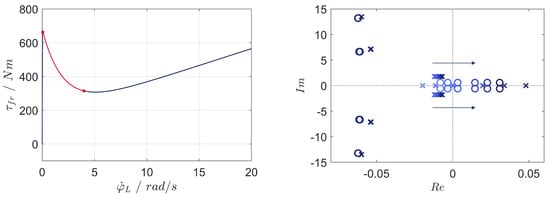 To analyze the stability of the open-loop linear plant and its zero dynamics (10) and (11), the pole-zero maps for varying slope coefficients are obtained and represented in Figure 2 (right). Here, it can be seen that the slope variation has a strong impact on the location of one real pole and one low-frequency complex conjugated pair of poles and zeros, while the dynamics of the higher-frequency modes is not affected. The low-frequency complex zero pair moves into the right-half plane (RHP), i.e., the system becomes nonminimum phase, for small slopes coefficients . It can be also seen that the real pole moves into the RHP for resulting in unstable system dynamics. As depicted in Figure 2 (left, red), the region of unstable operating points is rad/s.