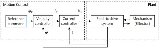 Currently, most modern mechanisms and machines are equipped with automated electric drive systems. Manufacturers of those systems typically offer a complex product with an individual software solution, e.g., a power converter with a fully parameterizable motion control system. Velocity control is one of the typical tasks for industrial systems. Due to simplicity in design and high robustness, the cascade control scheme with -controllers, depicted in Figure 3, have found wide practical application. Direct velocity measurements on the effector of the mechanism are often complicated and involve additional costs. Alternatively, they can be provided on the motor shaft via incremental or optical sensors. Therefore, for the presented system it means that only the first mass angular velocity is measured. From a theoretical point of view, this choice of system output for systems with more than one masses and distributed states induces zero dynamics []. As has been illustrated in Figure 2 (right), for systems operating in the negative slope region of a friction curve problems of unstable zero dynamics may occur.