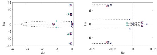Low-frequency part of root locus of closed-loop system (left) and its zoomed-in view for the 4 low-frequency modes (right). Poles of the open-loop system (blue), poles of the closed-loop system with (green), poles of the closed loop system with (red).