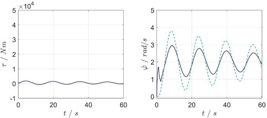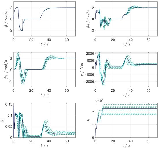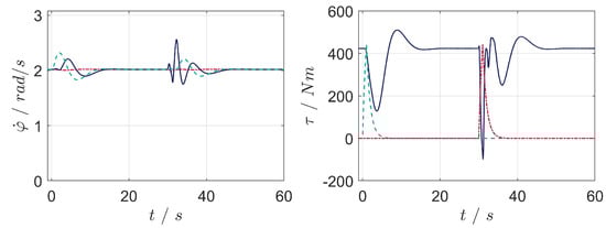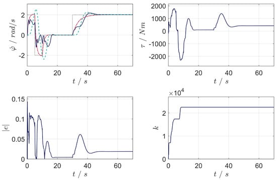 To perform the adaptation and reference tracking, the reference signal r depicted in Figure 11 (dotted gray) has been utilized for all scenarios. Initially, two pulse signals with an amplitude of 2 rad/s and width 5 s are applied to allow for an adaptation of the control gain ( s). After that, at time 30 s, a step signal is applied to evaluate the reference tracking of the closed-loop system ( s).