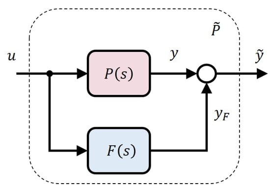 The idea of PFC-based control is to extend the plant of interest P with a PFC F, which achieves desired properties for the augmented plant , e.g., full relative degree, passivity, ASPR. This combination yields a new output (Figure 7), which is considered for further output feedback control design.