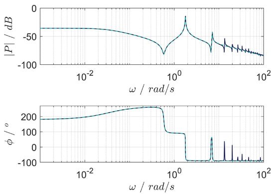 Applying the proposed design procedure yields a PFC of the same order as the plant. The order of the linearized system (10) and (11) depends directly on the number of discretization points n and is typically high. This makes computation and further practical implementation difficult. To overcome this problem, the order of the system or PFC has to be reduced. In this work, the modal truncation procedure has been applied to the high-order plant model []. The reduction order selection always depends on the specific application case and can be motivated using the frequency domain. In Figure 8, the Bode diagram of the linearized system is presented (blue). Here, it can be seen that mainly one unstable real pole and two low-frequency eigen-modes have a dominant impact on the system dynamics. Assuming that the higher-frequency modes are not excited by the drive system or external disturbances, a fifth-order model approximation is chosen (green).