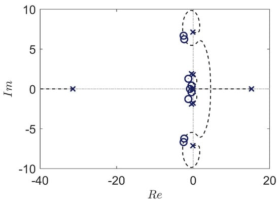 The concept of zero dynamics for a linear system is equivalent to the zeros of the associated transfer function []. The location of the zeros in the complex plane determines the stability of the zero dynamics. The system is known to be (strictly) minimum phase if the zeros of are in the left-half plane (LHP) ().