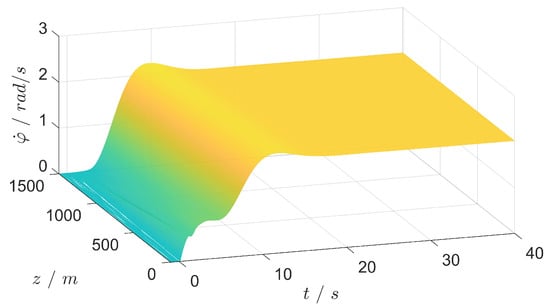 The obtained simulation results are illustrated in Figure 11, Figure 12 and Figure 13. From Figure 11, it can be seen that the absolute value of the control error converges to the prescribed after about 8.5 s resulting in an adapted control gain . The augmented output reaches the reference angular velocity value 14.2 s after the step and settles without overshoot. The performance measures of the reference tracking are summarized in Table 2 and Table 3 (Case 1). From Figure 12 it can be seen that not only the angular velocities on the boundaries and are stabilized, but also the distributed state itself.