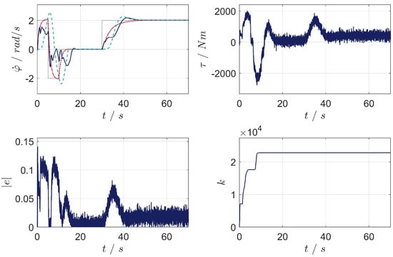 In this scenario, the control law adaptation and reference tracking in the presence of measurement noise are shown. To introduce the measurement noise, a Gaussian distributed random signal with variance of is utilized. The noise is applied to the measured angular velocity on the first mass . The obtained results are illustrated in Figure 14. Here, it can be seen that application of the noise does not deteriorate the adaptation of the control gain . In general, the measurement noise is evaluated from the transient response of and the corresponding parameter is chosen. It should be also emphasized that the high control gains boost the measurement noise considerable. This typically results in faster wear of the actuator and reduced performance []. To overcome this problem, an additional low-pass filter for noise signals with a larger variances is needed.