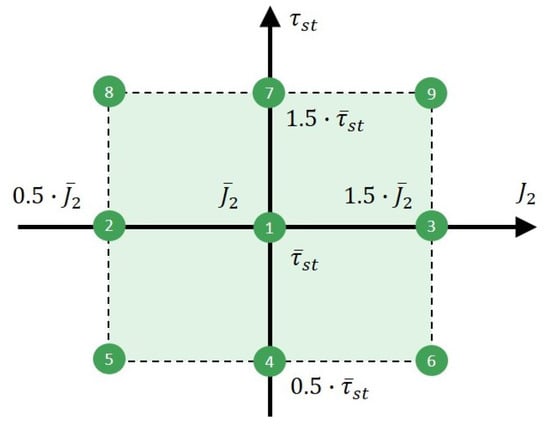 The domain of uncertain parameters is illustrated in Figure 15. Here, the nominal and worst cases of parameter variations are denoted with numbers. The nominal case 1 and following worst cases 2–9 have been used for the simulation study.