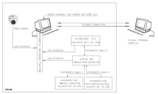 In the original experimental setup, a 24-way Centronics cable directly connected the PLC module to one of the hardware equipment. The cable had to be manually transferred between the hardware equipment. This was subsequently replaced by an intermediate micro-controller that controls the switching between the two hardware. The PLC module, micro-controller, and camera are always connected to a laboratory computer via USB cables. The laboratory computer has the software for programming the PLC module (SoMachine Basic). A remote user can connect to the laboratory computer via a remote desktop connection software to program the PLC module and select the hardware equipment.