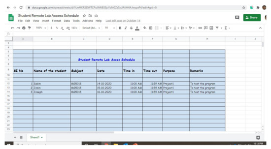 A simplified flowchart illustrating the procedure for operating the remote laboratory system is shown in Figure 5. Users are required to book time slots for using the system via a remote lab access schedule online document (Figure 6). When it is a user’s turn to use the system, they first open the remote access software on their computer. Next, they connect to the laboratory computer via a username and password. Following this, they need to open the micro-controller software (Remote Lab, refer to Section 3.1) to select the camera and access serial port settings. After selecting an experiment hardware for use, the user can use the standard PLC programming software to write, download, and test programs. Upon completion of the experiment (or time period expiry), the user powers off the hardware, closes the micro-controller software, and disconnects from the laboratory computer.