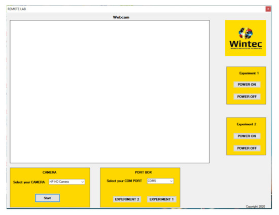 - Video Screen—The white rectangular portion under the heading “Webcam” is allocated to show the video of the hardware. This is accomplished via the web camera installed in the lab. The video captured from the web camera inside the lab is made visible in this section with appropriate programming done with windows forms application.