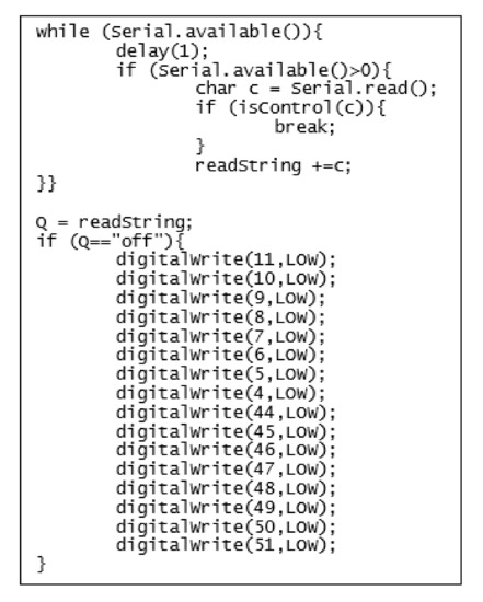 The USB serial port connection between the laboratory computer and the micro-controller was set up with a baud rate of 9600. The micro-controller program preconfigures the pins and inputs or outputs and assigns a default value to the output pins. Figure 12 shows the sample code for serial communication of data on the Arduino micro-controller. A string of data is read from the GUI program, and the control lines are switched off when an “off” command is received.