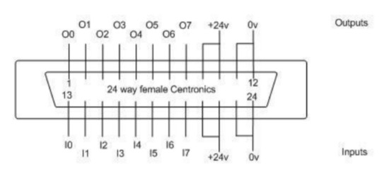 The wiring connections between the TM221CE24T PLC module and the two-experiment hardware is shown in Figure 13. The two 8-channel relay modules multiplex the connections to the PLC. When the relays are switched off, the lines are connected to the forward/reverse conveyor experiment. If the relays are energized via the GUI program, the control lines are switched over to the Festo sorting machine. Table 1 shows the input–output usage of the Centronics cable, and Figure 14 illustrates the physical pin connections. Figure 15 shows the connections between the power supply, Duinotech Mega 2560, and the 8-channel relay modules.