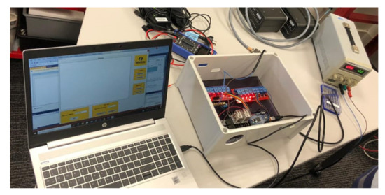 Figure 21 shows the full remote laboratory system set up in a teaching space. The laboratory computer is set up to communicate on the Wintec Institute’s Wi-Fi network. The remote student computer (missing from Figure 21) was also present in the teaching space during testing. However, it was connected to Vodafone’s 4G mobile network. The remote computer was able to stream video and control the hardware without any lag or delay. A sample video of the full system in operation is available for viewing (Video S1: demo_video.mp4).