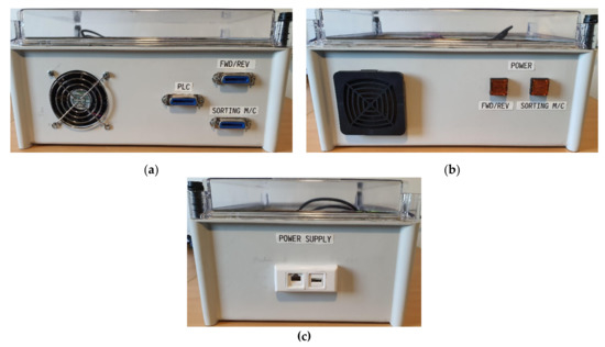 Side views of the final control box. (a) Centronics cable connections and exhaust fan; (b) Indicator lamps for experiment selection and air inlet vent; (c) Power supply connections—USB for micro-controller, and ethernet for relay controls to power supply box.