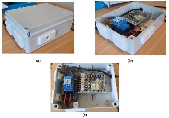 Power supply box layout. (a) Sealed box with 230 V AC and 24 V DC outputs; (b) Box with cover removed; (c) Plan view of open box showing relay connections and 24 V DC supply unit.
