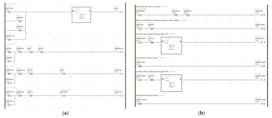 Sample ladder logic programs to test the operation of the experiment hardware. (a) Snippet of forward/reverse conveyor program; (b) Snippet of Festo sorting machine program.