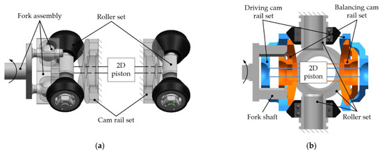 The overall architecture of the 2D transmission mechanism is mainly built of spatial conjugate cam. It includes the fork assembly, the roller set and the cam rail set, as shown in Figure 1a. The fork assembly is driven by a motor to make the roller set rotate. Then, the roller set undergoes axial reciprocating movement under the constraint of the cam rail set. The 2D piston is connected to the roller set and moves with the roller set. Based on the above architecture, Tong et al. [9] designed a 2D hydraulic unit pump, which realizes the integration of oil discharge and distribution through the two-degree-of-freedom movement of the piston. Shentu et al. [10] adopted dual 2D pistons to reduce the flow ripple of the 2D pump substantially. Jin et al. [11,12,13] proposed an error compensation method for the cam rail surface, which decreased the contact clearance between the rollers and the cam rail. Qian et al. [14] analyzed the volumetric efficiency of the 2D pump based on CFD, and proved that its volumetric efficiency was more than 90% via experiments. Huang et al. [15,16,17] proposed a 2D transmission mechanism with inertial force balanced, as shown in Figure 1b, which increased the rotational speed of the 2D pump to 8000 rpm successfully, achieving high speed preliminarily. Ding et al. [18,19] analyzed the oil churning loss of the roller set and cam rail set of the 2D transmission mechanism based on CFD, and carried out experiments to obtain the empirical formula of churning loss torque.