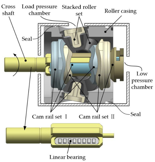 According to Figure 2, when the transmission mechanism works, the cross shaft, as the input shaft, drives the two cam rail sets to rotate synchronously by contacting the side walls of the inner and outer fork shafts through the linear bearing. The load pressure chamber is filled with high-pressure oil, which is on the outside of the roller casing. High-pressure oil creates a pressure difference with the low pressure chamber inside, pressing the large end of the roller shaft, so that the N cone rollers are attached to the cam rail surface closely. In addition, the parts are lubricated by the low-pressure oil in the low pressure chamber. Afterwards, the cam rails are constrained by the stacked roller set, which forces the cam rail sets to move in equal acceleration and deceleration reciprocating linear motions. Since the installation phases of the two cam rail sets are different, the two cam rail sets will drive their respective 2D pistons to move in reverse reciprocating linear motions. The 2D pistons also moves in rotational motions synchronously, so as to realize the conversion and integration of two-degree-of-freedom motions.
