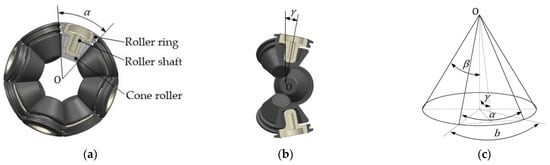 The stacked roller set is composed of N cone roller components in a specific geometric law. Each cone roller component consists of a roller ring, a roller shaft and a cone roller. The front view of the stacked roller set is shown in Figure 3a. The cone rollers contact in pairs. All contact lines lie in the same plane and intersect at the center O. Figure 3c shows the projection of the contact lines on the bottom of the cone roller. The N cone rollers are alternately arranged on both sides of the contact plane. Their axes form an angle γ with the contact plane, as shown in Figure 3b. The specific geometric law of the N cone rollers satisfies the Equation (1):