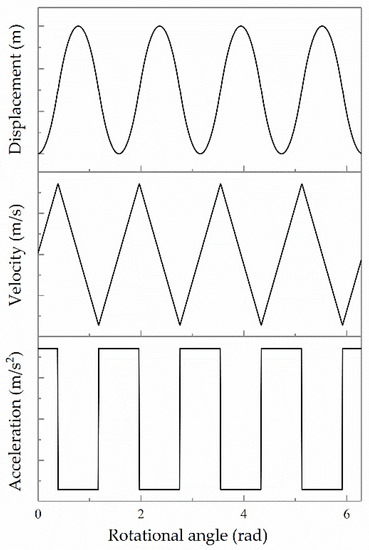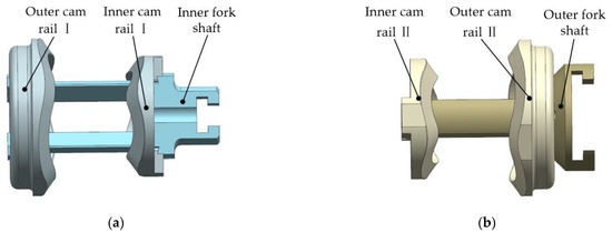 The cam rail set I is composed of an outer cam rail I, an inner cam rail I and an inner fork shaft, as shown in Figure 4a. The outer cam rail I and inner cam rail I are a pair of conjugate end cams. The cam surface is formed of equal acceleration and deceleration curves with N/2 cycles. Its motion law is shown in Figure 5. The two cam rails are installed on the inner fork shaft in the way of peak corresponding to peak. The side wall of the inner fork shaft is in contact with the cross shaft and the locking structure at the right end is used to connect the 2D piston. The structure of the cam rail set II is similar to that of the cam rail set I, as shown in Figure 4b. However, the installation phase of the two is different, whose angle difference is 2π/N in the way of peak corresponding to trough.