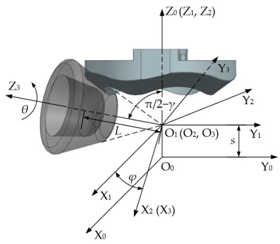 In order to parameterize the surface of the cam rail and cone rollers, the global coordinate system O0−X0Y0Z0 and the moving coordinate system O3−X3Y3Z3 are first set up. The reference frame is shown in Figure 6. The axis Z0 of the coordinate system O0−X0Y0Z0 is collinear with the rotational axis of the cam rail. The axis Z3 of the coordinate system O3−X3Y3Z3 is collinear with the rotational axis of the cone roller. In addition, the origin O3 located at the axis Z0 coincides with the vertex of the cone roller. To describe the spatial relationship between the cone roller and the cam rail via homogeneous coordinate transformation, the relative coordinate systems O1−X1Y1Z1 and O2−X2Y2Z2 are set up. The coordinate system O1−X1Y1Z1 is obtained by the translation of the coordinate system O0−X0Y0Z0 along the axis Z0. The coordinate system O2−X2Y2Z2 is obtained by the rotation of the coordinate system O1−X1Y1Z1 around the axis Z1. Moreover, the coordinate system O3−X3Y3Z3 is obtained by the rotation of the coordinate system O2−X2Y2Z2 around the axis X2, where the rotational angle is π/2−γ.