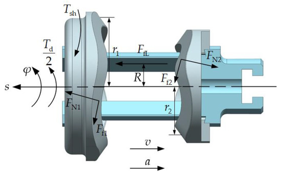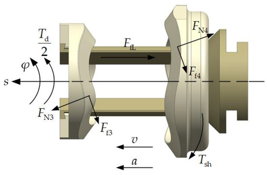As shown in Figure 7, the displacement s and the rotational angle φ are taken as generalized coordinates. Then, the dynamic equilibrium equations are established in these two coordinates. It is supposed that the instantaneous torque of the transmission mechanism is , so the input torque of the cam rail set I will be . The input torque acts on the side walls of the inner fork shaft and generates friction . The outer cam rail I is subjected to the normal force and the friction of the stacked roller set, and its outer peripheral surface is subjected to the oil stirring shear moment at the same time. The inner cam rail I is subjected to the normal force and the friction of the stacked roller set. Since the rotational speeds of the inner and outer cam rails are the same, the oil stirring shear moment can be ignored, which is caused by the relative movement of the inner and outer cam rails. The space angles of the forces acting on the outer cam rail I correspond to the space angle functions mentioned in the previous section, because the outer cam rail I is in the returning stroke, which means that the cone roller works in the thrusting stroke. On the contrary, since the inner cam rail I is in the thrusting stroke, the phase difference of its space angle functions is 2π/N. Considering the number of the cone rollers, the forces acting on the cam rail need to be multiplied by N/2. In summary, the two dynamic equilibrium equations can be derived as: