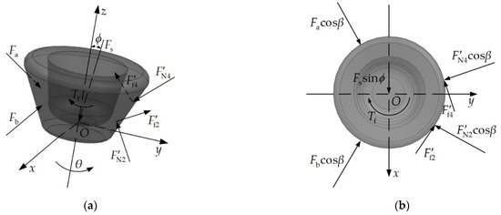 Force analysis of the cone roller: (a) schematic diagram of the forces acting on the cone roller; (b) projection of the forces.