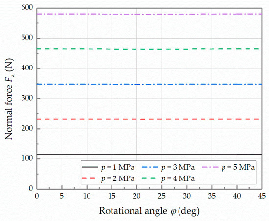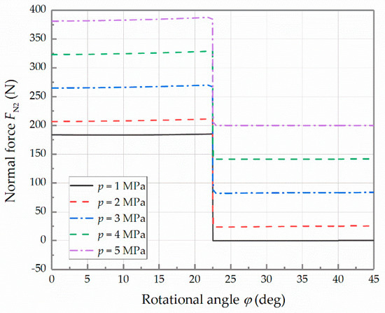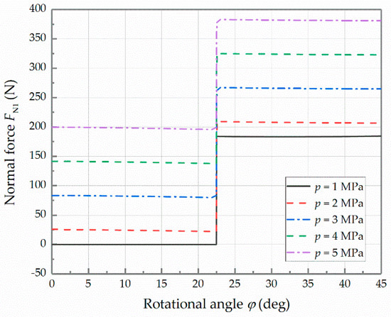 The designed limit of the rotational speed of the transmission mechanism is 10,000 rpm. The working condition will be the worst when the rotational speed achieves the limit. Hence, the limit can be used as a preset value for the following research. At different load pressures, the curves of the normal forces and with respect to the rotational angle are shown in Figure 10 and Figure 11. When the rotational angle changes from 0° to 22.5°, the cam rail set I is moving to the right with the equal acceleration. It is noticeable that the normal force is greater than the normal force to provide the acceleration to the right direction. When the rotational angle is equal to 22.5°, the normal forces and are both mutated due to the flexible impact of the equal acceleration and deceleration motion law. When the rotational angle changes from 22.5° to 45°, the cam rail set I is moving to the right with the equal deceleration. It is apparent that the normal force is greater than the normal force to provide the acceleration to the left direction. Moreover, the normal force is equal to 0 in the section that the cam rail set I moving to the right with the equal acceleration, when the load pressure is 1 MPa. Consequently, it indicates that the left cone rollers do not contact with the outer cam rail I. Thus, it can be deduced that there is a clearance between the left cone rollers and the outer cam rail I. When the normal force is equal to 0, it can be deduced that there is a clearance between the right cone rollers and the inner cam rail I, as well. When the load pressure is larger than 2 MPa, the normal forces and are positive, which means that the clearance has been eliminated. To be precise, the critical value is 1.60 MPa when the normal forces turn to positive throughout the certain working section.