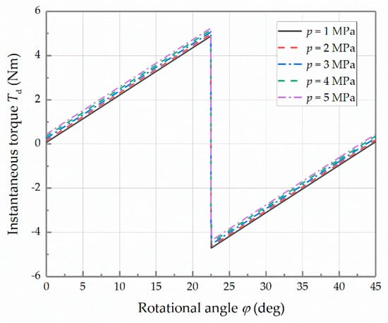At different load pressures, the curves of the instantaneous torque with respect to the rotational angle are shown in Figure 13. When the rotational angle changes from 0° to 45°, the instantaneous torque increases to the peak value linearly at the beginning. At the point = 22.5° the instantaneous torque jumps to the trough value. Then, it linearly increases to the initial value again. It shows that the shape of the curves of the instantaneous torque is sawtooth in the complete working process. Compared with the rotational angle, the load pressure has little effect on the instantaneous torque.