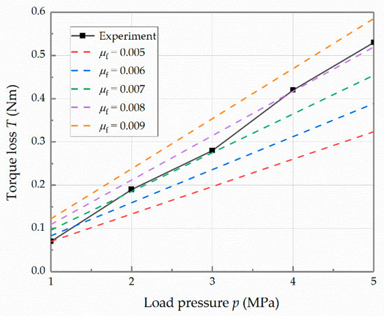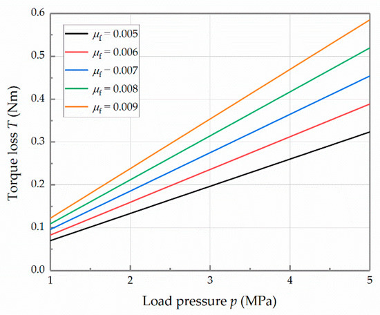 Curves of the torque loss with respect to the load pressure at different friction coefficients.