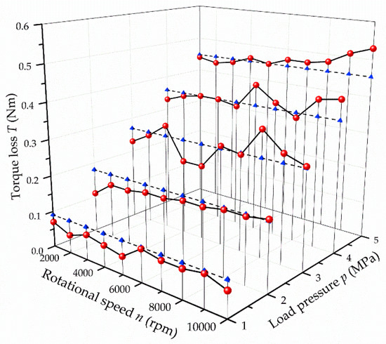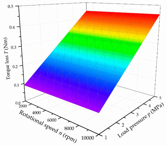 When the friction coefficient is equal to the preset value, which is 0.007, the function of the torque loss with respect to the load pressure and the rotational speed can be obtained according to Equation (23). The function can be expressed as: