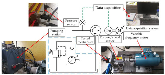 In order to verify the correctness of the mathematical model and analytical results, an experiment rig is built to measure the torque of the high-speed transmission mechanism with a stacked roller set. The schematic diagram of the experiment rig is shown in Figure 17. The pumping station supplies the high-pressure oil for the load pressure. As the pressure of its returning oil can be regarded as zero, the pressure difference used to compress the stacked roller set can be equivalent to the pressure measured in the port of the load pressure chamber. A three-phase variable frequency motor is used to drive the transmission mechanism. The maximum rotational speed of the motor can reach 20,000 rpm. The pressure sensor is utilized to measure the load pressure, and the torque/speed sensor is used to measure the torque and rotational speed of the transmission mechanism. The load pressure, torque and rotational speed can be collected by the data acquisition card, and are processed through LabVIEW on the computer. The results are displayed on the screen for reading and recording. The details of the relevant sensors are shown in Table 2.