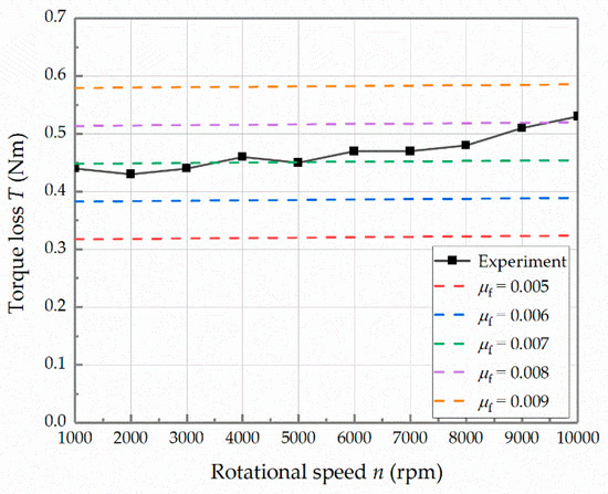Curves of the torque loss with respect to the rotational speed at different friction coefficients.