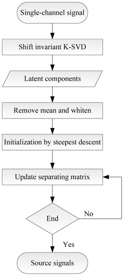 The proposed single-channel BSS method based on shift invariant K-SVD is divided into two stages: shift invariant dictionary learning and ICA. Firstly, the shift invariant K-SVD dictionary learning algorithm is employed to obtain basis functions and their corresponding latent components and the multiple latent components can constitute virtual multi-channel signals. Then, ICA is conducted to separate multiple source signals using the constructed virtual multi-channel signal.