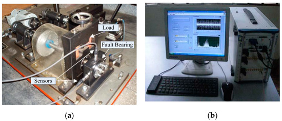 To validate the proposed method, an experiment of a compound fault of rolling bearings was carried out on the QPZZ II test bench that can simulate faults in rotating machinery, including compound faults of outer and inner races, outer race and rolling element, and outer race, inner race and rolling element. The experiment rig is demonstrated in Figure 2a. In rolling bearing, the inner race revolves with the main drive shaft at 800 r/min, while the outer race is installed on the bearing housing. An acceleration sensor is respectively installed on the horizontal and vertical positions of bearing housing to synchronously collect the vibration signals of the bearing in two directions. The data acquisition system is shown in Figure 2b, whose sampling frequency is 8192 Hz. The type of experiment bearing is NU205, and the main geometric parameters and theoretical fault characteristic frequencies are described in Table 1 and Table 2, respectively. Among them, Z, d, D, θ represent number of rolling elements, rolling element diameter, pitch diameter and contact angle individually. fr, fc, fi, fo and fb separately denotes rotation frequency of drive shaft, rotation frequency of cage, characteristic frequency of bearing inner race fault, outer race fault and rolling element fault. In total 26 sets of signal are collected under each compound fault state of the rolling bearing. Each signal has 8192 points and the duration is 1 s.