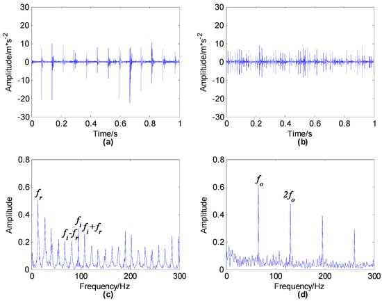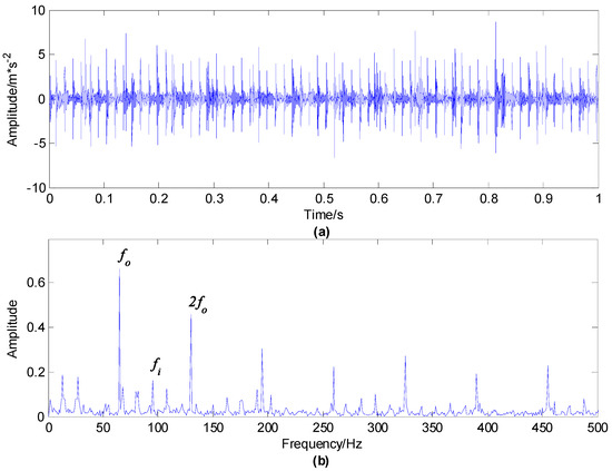 The time waveform and envelope spectrum of the first set of vibration signals of the compound fault of a rolling bearing with an outer race, inner race and rolling element fault are demonstrated in Figure 11. As shown in Figure 11b, and its multiplier frequencies have obvious peaks. Besides, obvious peaks under can be found and there are side frequencies on both sides of with the interval of rotation frequency , however cannot appear. The analysis of the mixed signal demonstrates that there are obvious outer and inner race faults, but it is easy to ignore the weak rolling element fault.