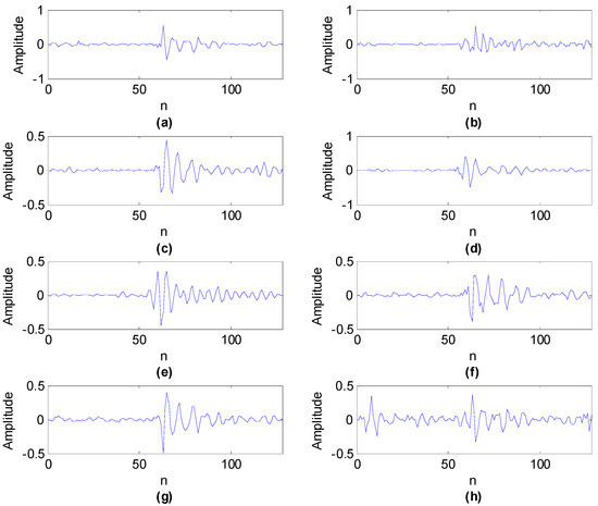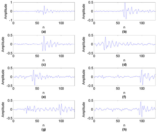Firstly, shift invariant K-SVD was utilized to analyze the first set of vibration signals of the compound fault of a rolling bearing with outer and inner race faults. The main parameters of shift invariant K-SVD are: the length of basis function is 128, the basis function number is 8, and the signal length is 8192 so the sparsity is set to 1.2 × 8192/128 ≈ 77 [11]. The learned eight basis functions are exhibited in Figure 4. It can be seen that these basis functions can successfully capture the fault characteristics in the mixed signal.
