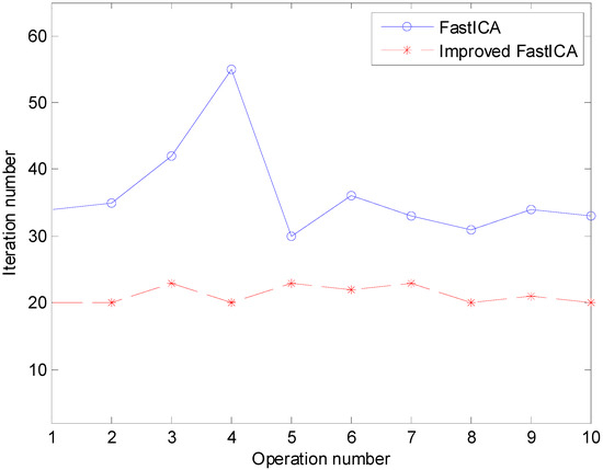 Furthermore, the iteration numbers of the original FastICA and improved FastICA are presented in Table 5 and Figure 14, which prove that the improved FastICA algorithm outperforms original FastICA in convergence speed and stability.