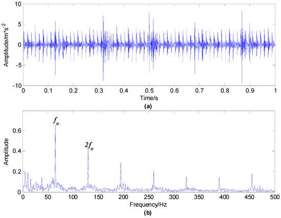 Rolling bearing signal with outer race and rolling element compound fault: (a) time waveform; (b) envelope spectrum.