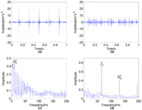 Estimated source signal using improved FastICA: (a) source signal ; (b) source signal ; (c) envelope spectrum of ; (d) envelope spectrum of .