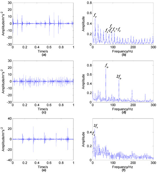 Figure 9 shows that improved FastICA can succeed in isolating the source signals. For source signal in the envelope spectrum the peak values under and its multiplier frequencies are obvious, indicating that represents the source signal of the outer race fault. The source signal is actually the impulse signal produced by the rolling element fault and in the envelope spectrum is not obvious, yet the peak values under the rotation frequency of cage and its multiplier frequencies are obvious, which is because the impact signal caused by a rolling element fault is modulated by the rotation frequency of the cage. When the failed rolling element runs to the load-bearing area, the load is the largest and the impact energy is also large, while once it leaves the load area, the load on it decreases rapidly and thus the impact energy is also rapidly reduced, especially when running to the top when the load is very small or there is even no load, hence there is no obvious impact signal. Therefore, in the envelope spectrum the rotation frequency of cage and its multiplier frequencies are obvious.