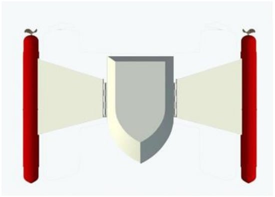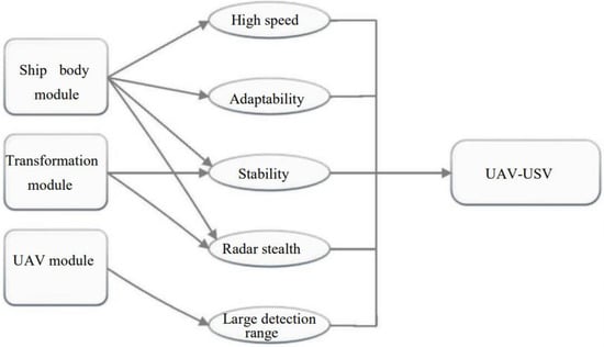 Figure 2. The main module of the ship includes the whole ship and the radar stealth material painted on the surface of the ship. The deformation module can control the deployment or retraction of both wings to ensure the radar stealth of the ship and the stability of the ship at high speed. The UAV module enables the system to have a larger cruising detection range and to reconnoiter places that are inaccessible or dangerous to the ship.